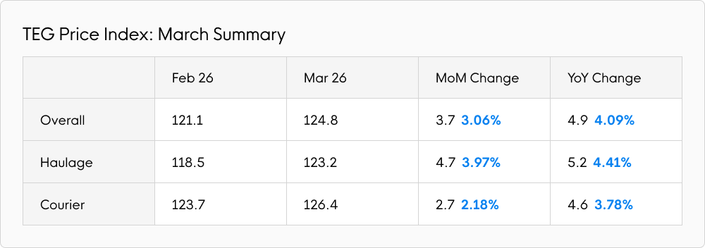 The TEG Price Index increased by 3.7 points (3.06%) in March to reach 124.8, an increase almost entirely attributable to heightened Easter demand. Year-on-year, transport prices increased by 4.9 points (4.09%), an increase once again reflected by the impact of Easter.